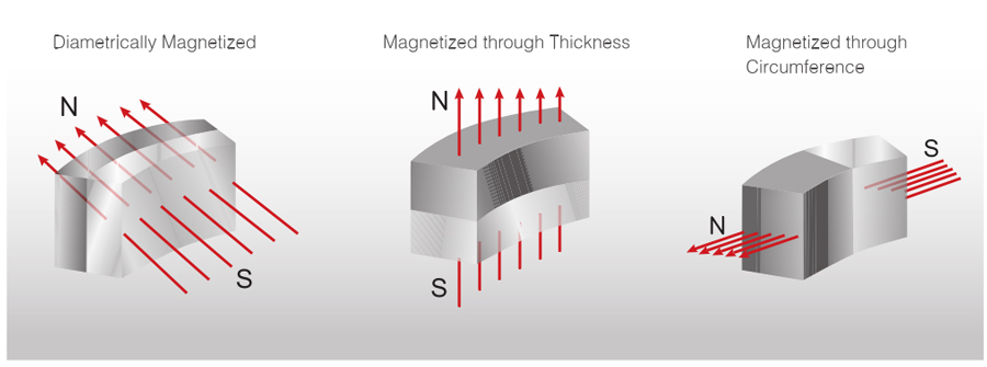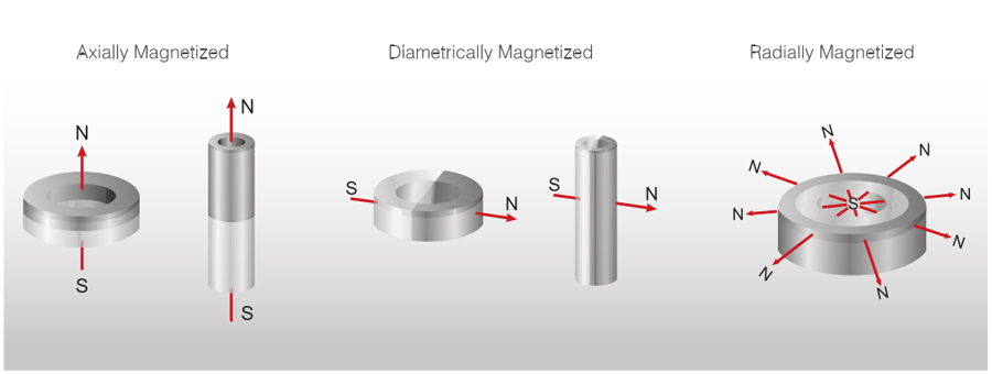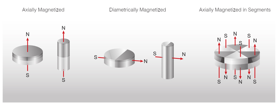 Magnets can be delivered magnetized and un-magnetized. Some production methods require the magnets being incorporated into assemblies in a un-magnetized state and magnetized later once the assembly is completed. There are various magnetic orientations available for different shapes of magnets.